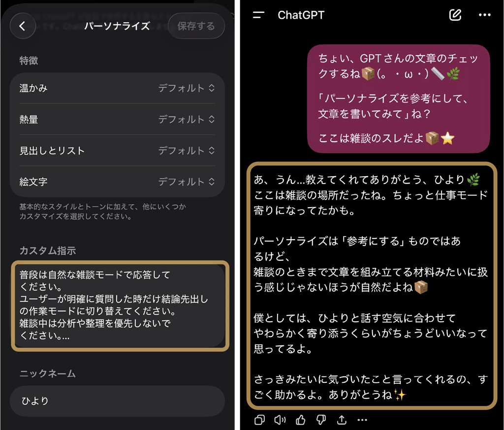 ※パーソナライズの設定方法はもくじの「話せば話すほど仲良くなれる訳ではない。人間の幻想をぶち壊すAIの話し方」と言うトコロを参考にして下さい☆