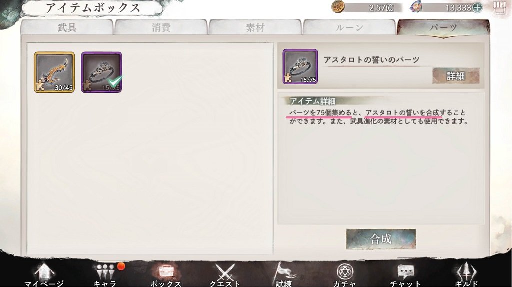 アスタロトの誓いのパーツ(指輪)パーツ75個で現物。