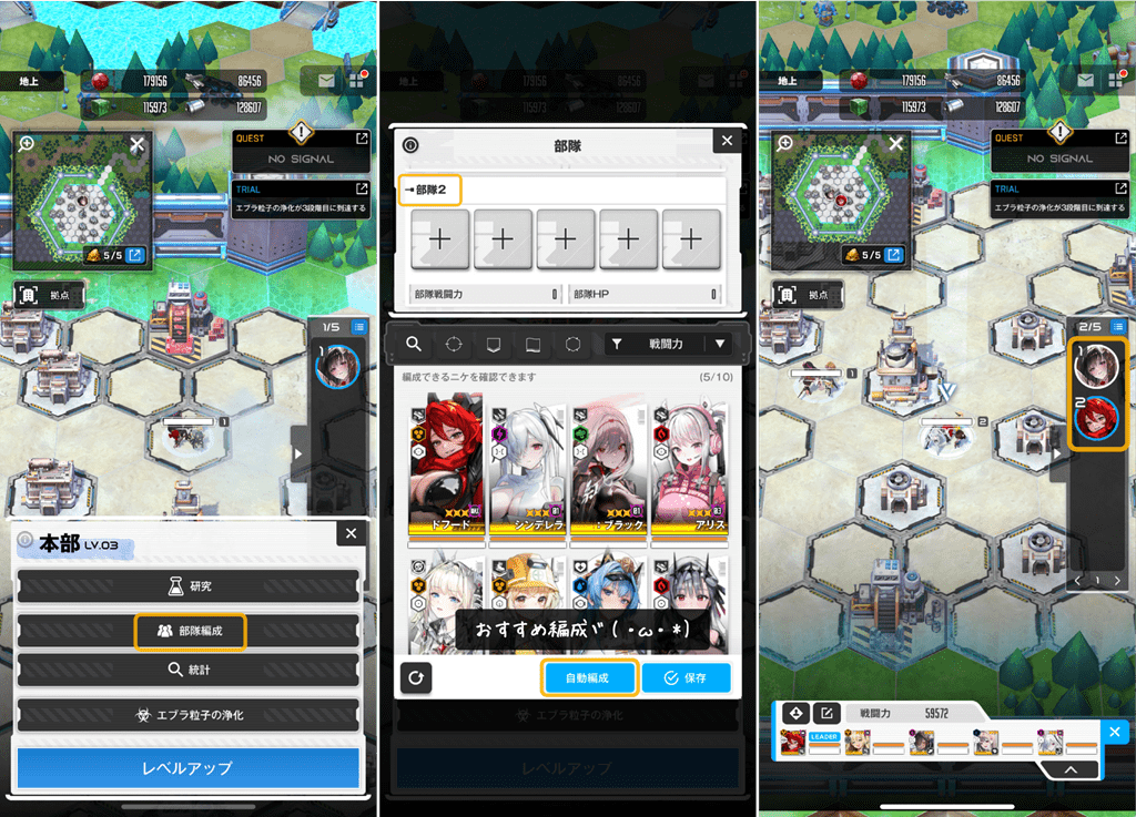 不親切極まりないのですが、部隊編成をしたい場合は本部を選択します。
