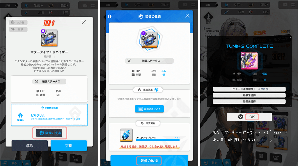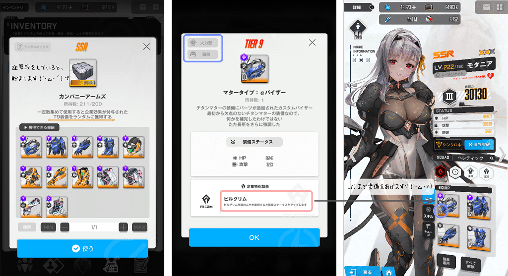 オバロ装備にするとキャラクターから外せなくなる(固有装備)になるので、よく使うニケの装備から作った方がいいですよヾ(・ω・*)